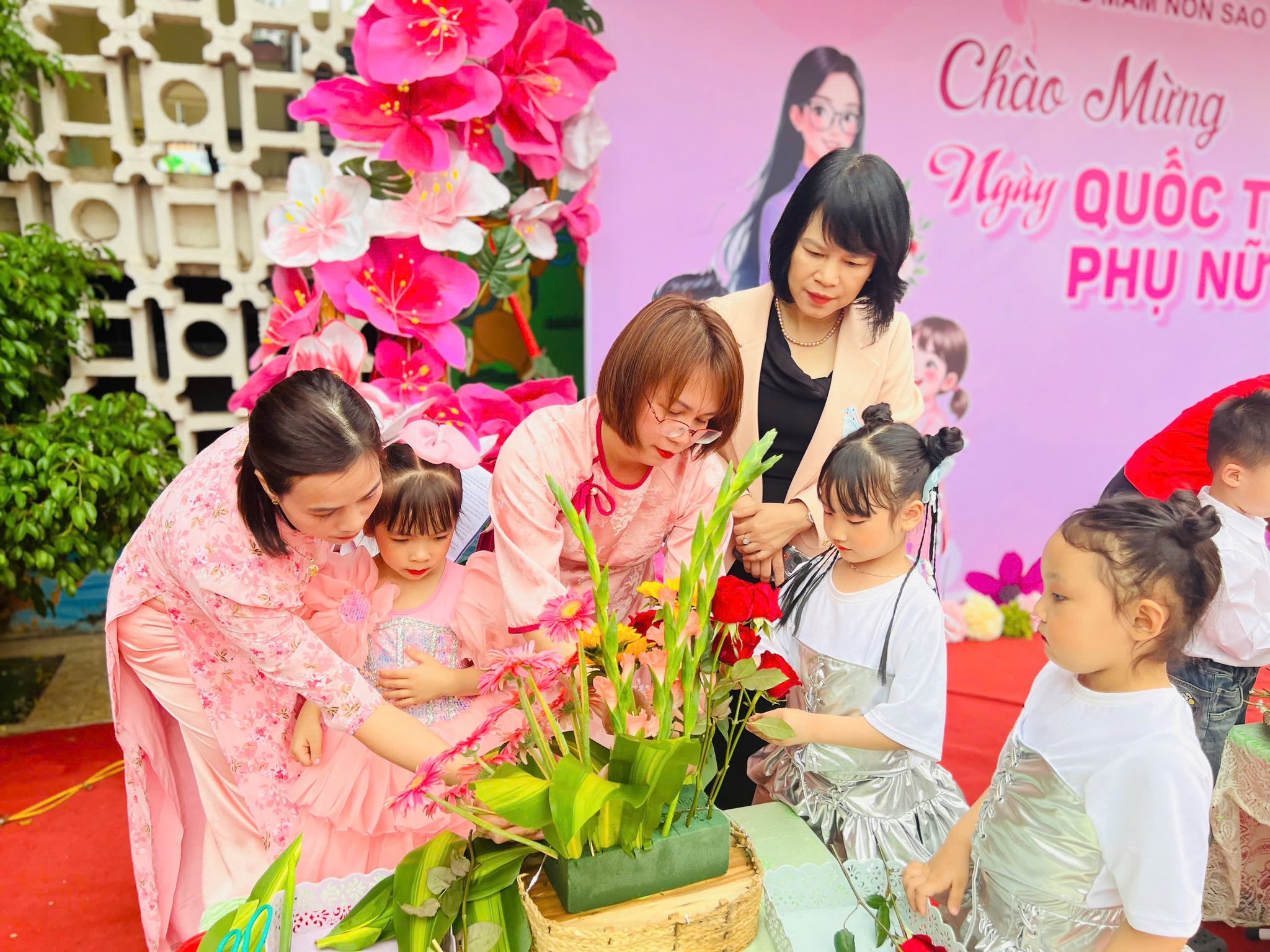 Trong chương trình, cô và trò khối mẫu giáo 5 tuổi hào hứng tham gia trải nghiệm cắm hoa. Cô và các con tự tay chuẩn bị , chăm chút khéo léo cắm từng bông hoa để tạo nên những lẵng hoa nhỏ xinh gửi tặng bà và mẹ. Các bạn khối mẫu giáo 4 tuổi cũng rất khéo léo cùng cô làm nên những tấm bưu thiếp xinh xắn với những lời chúc ngộ nghĩnh, đáng yêu. Bên cạnh đó, các em bé khối mẫu giáo 3 tuổi và nhà trẻ đã mang đến màn biểu diễn thời trang vô cùng đáng yêu, làm cho không khí chương trình thêm rộn ràng và tràn ngập tiếng cười.