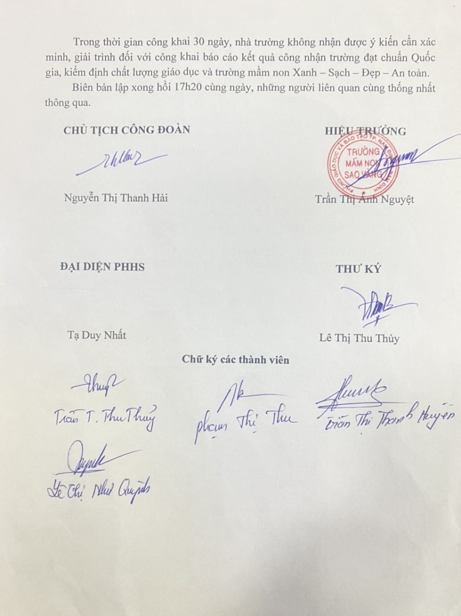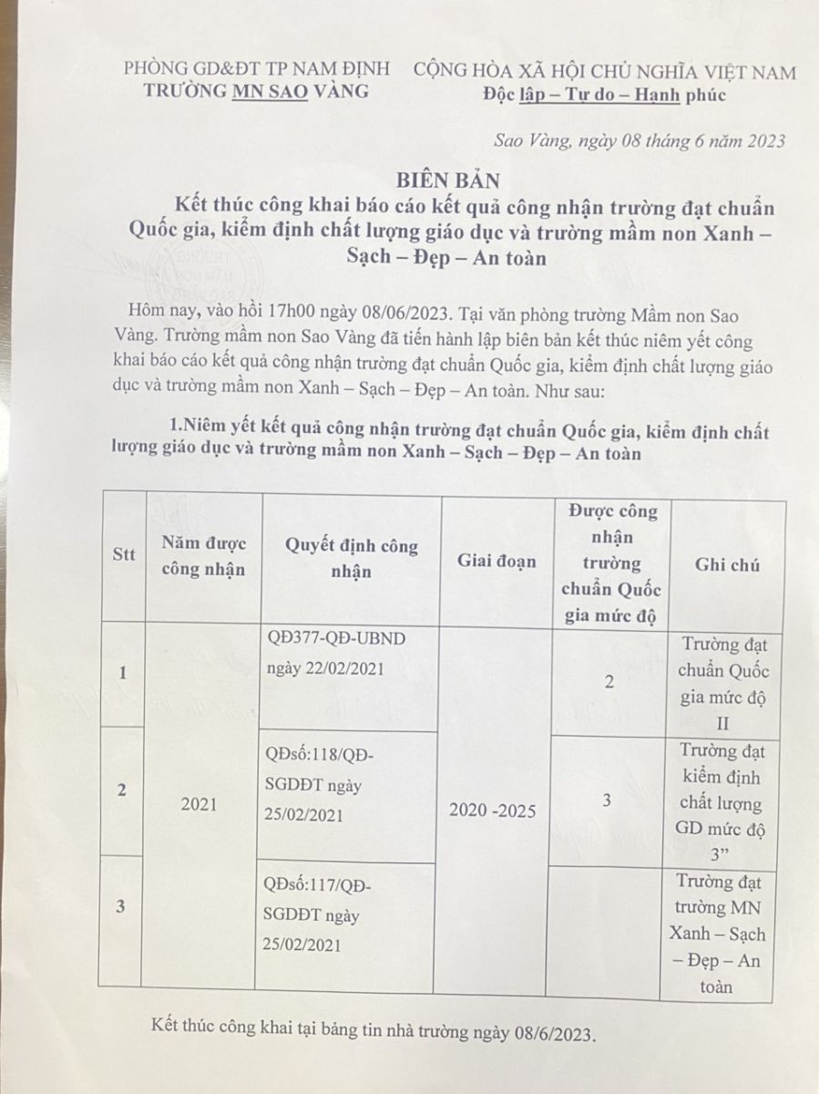 Kết thúc công khai báo cáo kết quả công nhận trường đạt chuẩn Quốc gia, kiểm định chất lượng giáo dục và trường mầm non Xanh – sach – Đẹp – An Toàn
