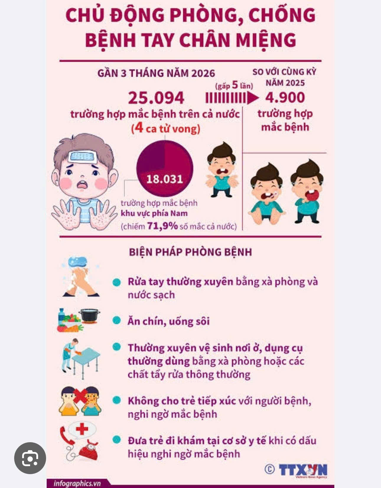 – Người chăm sóc trẻ theo dõi sát sức khỏe của trẻ để phát hiện kịp thời các trường hợp mắc bệnh. Khi thấy trẻ bị sốt và xuất hiện nốt phỏng ở bàn tay, bàn chân hoặc miệng, cần đưa trẻ đến các cơ sở y tế nơi gần nhất để được khám, điều trị kịp thời